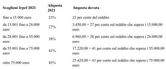 Vediamo la cosa più approfonditamente: resterà al 23% l’aliquota Irpef prevista per i contribuenti con redditi fino a 15.000 euro; per lo scaglione successivo e fino a 28.000 euro si va verso un taglio di due punti, dal 27% al 25%, mentre scenderà al 35% l’aliquota successiva, applicata fino a 50.000 euro di reddito, superati i quali si passerà al 43%. E più schematicamente: viene soppressa l’aliquota del 41%; la seconda aliquota Irpef viene ridotta dal 27% al 25%; viene ridotta dal 38% al 35% la terza aliquota Irpef, applicata ai redditi fino a 50.000 euro; per i redditi superiori a 50.000 euro, l’aliquota Irpef 2022 è pari al 43% (fino al 31 dicembre 2021 era prevista oltre i 75.000 euro).