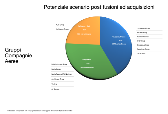 Nello scenario post-acquisizioni, quindi ipotizzando che Air Europa passi sotto il cappello di IAG e che ITA vada sotto Lufthansa, ecco che la situazione per Air France peggiora e non di poco. Infatti, Air France scenderebbe a 1.580 voli settimanali, registrando una quota di mercato del 25%, contro il 42 % di Lufthansa (+6%) con più di 2.640 voli alla settimana. Non si scosta di molto il Gruppo IAG, che invece salirebbe così al 30% con un numero di voli pari a 1.927 voli a settimana.