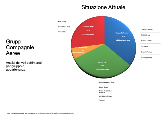 Attualmente, infatti, Air France può contare su un numero di voli settimanali di gruppo di oltre 1.755 voli che corrisponde a una quota di mercato del 28% rispetto al totale dei tre gruppi messi assieme. Il Gruppo Lufthansa invece detiene già una quota di mercato del 36% con più di 2280 voli settimanali mentre il Gruppo IAG che fa capo a British Airways, e che ha sede a Madrid, ha una quota di mercato del 30%, con più di 1.920 voli.