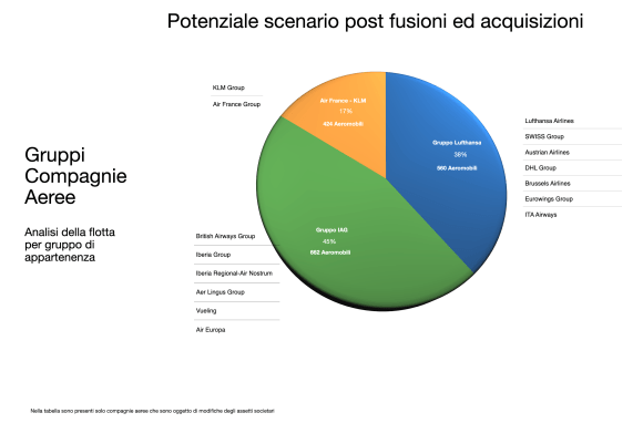Analizzando anche le fotte di gruppo nello scenario post-acquisizioni possiamo notare che la flotta aerea più numerosa appartiene invece al Gruppo IAG con 662 aeromobili con una quota di mercato del 45%. Air France-KLM invece registra “solo” 424 aeromobili con una quota di mercato del 17% rispetto alle concorrenti, mentre il Gruppo Lufthansa acquisendo ITA andrebbe a totalizzare una flotta complessiva di 560 aeromobili con una percentuale del 38%.