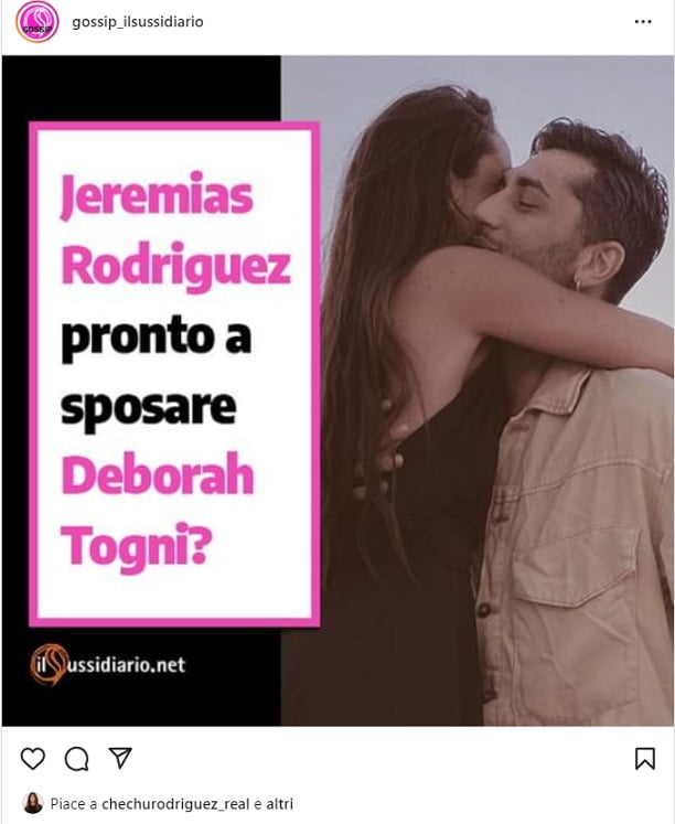 Cecilia Rodriguez ha lasciato un like al post in cui parliamo della possibilità di imminenti nozze tra suo fratello Jeremias Rodriguez e la fidanzata Deborah Togni. Un gesto che parrebbe confermare che effettivamente i due hanno in progetto di diventare a breve marito e moglie. Se l’indiscrezione trova dunque conferma nel gesto della Rodriguez, non conosciamo al momento dettagli sul matrimonio. Ignota la data e le altre informazioni sull’evento che saranno annunciate dai diretti interessati nel momento in cui vorranno ufficializzare la notizia pubblicamente.