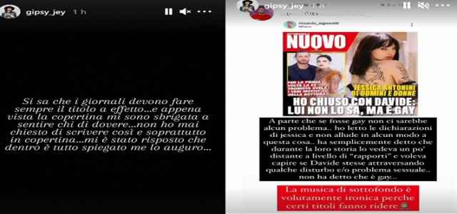 Jessica Antonini fa chiarezza sul titolo della copertina del settimanale Nuovo a cui ha rilasciato un’intervista dopo la fine della sua storia con Davide Lorusso. “Si sa che i giornali devono fare sempre titoli a effetto e appena vista la copertina mi sono sbrigata chi di dovere. Non ho mai chiesto di scrivere così e soprattutto in copertina. Mi è stato risposto che dentro è tutto spiegato. Me lo auguro”, scrive su Instagram l’ex tronista, A confermare la versione di Jessica Antonini è Amedeo Venza. Il blogger, su Instagram, scrive: “Ho letto le dichiarazioni di Jessica e non allude in alcun modo a questa cosa” – scrive Amedeo Venza tra le storie di Instagram. “Ha semplicemente detto che durante la loro storia lo vedeva un po’ distante a livello di ‘rapporti’ […] Non ha detto che è gay”, conclude Amedeo Venza (aggiornamento di Stella Dibenedetto).