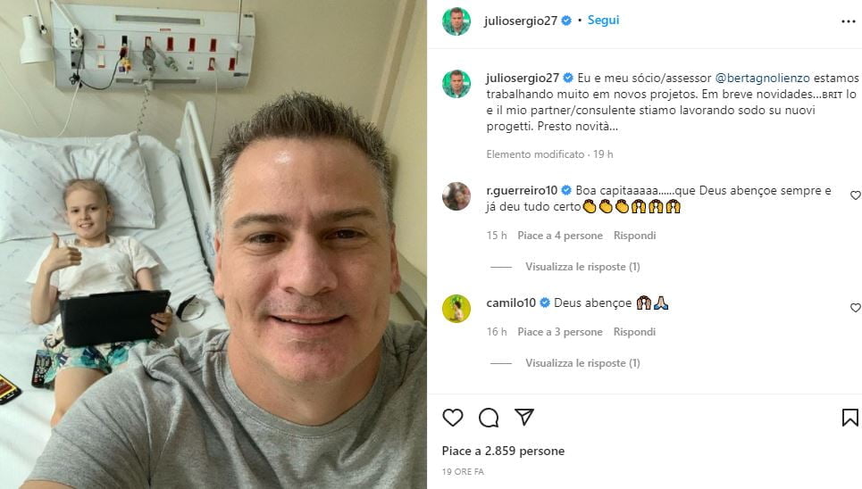 Pochi giorni dopo l’operazione Julio Sergio invitò i suoi ex colleghi conosciuti durante la permanenza nella capitale, leggasi Andrea Pirlo, Buffon, Francesco Totti, Neymar, Leonardo Bonucci, Cuadrado e Cristiano Ronaldo, ad inviare un affettuoso video-messaggio al proprio figlio, di modo di sostenerlo in questa durissima lotta. Moltissimi i commenti all’ultimo post di Julio Sergio, a cominciare da numerosi calciatori brasiliani come Leandro Franco, Fernando Camilo, Roger Guerriero, tutti ovviamente di in bocca in lupo e pronta guarigione. Anche il profilo ufficiale Instagram della Roma non ha voluto far mancare il suo supporto, commentando con un cuoriocino di colore nero lo scatto pubblicato.