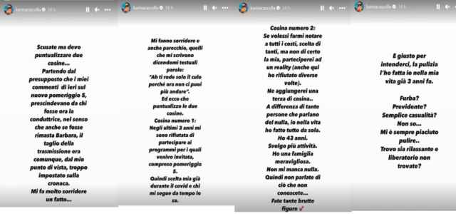 L’opinionista, inoltre, ha puntualizzato: “Mi fanno sorridere e anche parecchio, quelli che mi scrivono dicendomi testuali parole: “Ah ti rode solo perché ora non ci puoi più andare”. Ed ecco che puntualizzo le due cosine. Negli ultimi 3 anni mi sono rifiutata di partecipare ai programmi peri quali venivo invitata, compreso Pomeriggio 5. Quindi scelta mia già durante il covid e chi mi segue da tempo lo sa. Cosina numero 2: Se volessi farmi notare a tutti i costi, scelta di tanti, ma non di certo la mia, parteciperei ad un reality (anche qui ho rifiutato diverse volte)”, riporta Biccy.
