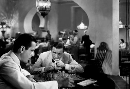 Dopo il prologo già citato, egli assiste impassibile all’arresto di Ugarte (Peter Lorre) – che come tanti profittatori cerca di contrabbandare dei visti di transito per uscire da Casablanca – e a riaffermare questa sua posizione di “politica estera” lo vediamo rimettere a suo posto un bicchiere che si era rovesciato su uno dei tavoli in seguito alla violenta colluttazione coincisa con il fatto: il calice non è ancora pronto a essere sparso, consumato. E come questo, dopo quello vuoto iniziale accanto agli scacchi, ce ne saranno ancora altri a segnalare il suo percorso fino al famoso finale all’aeroporto («Grazie per la vostra lealtà. E bentornato alla lotta: ora so che la nostra parte vincerà» sono le ultime parole di Victor Laszlo). Non senza essere prima passato attraverso il severo ma quanto mai veritiero vaglio di entrambi gli eroici coniugi europei: «Sapete a chi somigliate? A un uomo che vuole convincere se stesso di qualcosa in cui non crede. Ognuno ha un destino. Buono o cattivo che sia. […] Si direbbe che cerchiate di sfuggire a voi stesso. Non ci riuscirete».