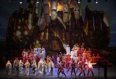 La sproporzione del suono orchestrale di fronte a tanto apparato video è quasi imbarazzante. Chissà se gli artisti della Fura e lo stesso Zubin Mehta, che da direttore giustamente vuole innovare, se ne rendono conto. Ma intanto la nave di Tannhäuser va, in fuga dalla dea: «Fuggo l’eccesso della tua seduzione… Devo ritornare al mio mondo terrestre/ qui da te solo schiavo io posso diventare/ di libertà io sento il desiderio». La dea, con braccia da dea indiana fiammeggianti, ricorre a una leonardesca ruota volante veleggiante sul palcoscenico per un’ultima seduzione, ma il cantore Tannhäuser vuole tornare fra noi. Che intanto facciamo ordine nella visione: uno schermo-velo sta sulla bocca del palcoscenico e un altro megaschermo fa da fondale: in mezzo i cantanti, gli attori, l’azione. Enormi gocce d’acqua vagano come serpenti: effetti speciali degni di un film di fantascienza in 3D.