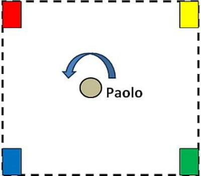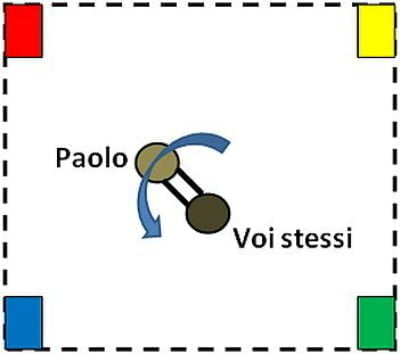A questo punto dovete simulare la rotazione della Luna attorno alla Terra. Nell’ipotesi che in questa rappresentazione astronomica siate voi stessi a interpretare il ruolo del nostro pianeta, dovete portarvi al centro della stanza, prendere il vostro amico Paolo per le mani (con la faccia rivolta verso di voi) e farlo ruotare attorno a voi in modo da riprodurre la rotazione della Luna attorno alla Terra. Ora, durante questa rotazione, chiedete nuovamente a Paolo di dirvi i colori dei fogli posti agli angoli della stanza quando li incontra con lo sguardo. Come prima, quando ruotava su se stesso, Paolo vi ripeterà nella corretta sequenza i quattro colori.