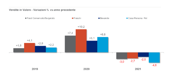 Il maggiore calo è previsto per il secondo semestre, quando cioè si faranno sentire con più vigore due tendenze concomitanti. La prima riguarda la ripresa dei consumi fuori casa – ovvero quella attratta da bar e ristoranti – che, in coincidenza con l’auspicato esaurirsi dell’epidemia, eroderà una parte delle vendite alla distribuzione organizzata. La seconda rimanda invece alle difficoltà di reddito delle famiglie: la ripresa infatti sarà lenta e potrebbe manifestarsi con maggiore forza solo a partire dalla seconda metà del 2022.