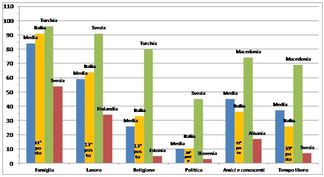 Il ranking dei consensi rispetto al guadagno vede al primo posto gli albanesi (96%) e all’ultimo i danesi (54%), che vivono nel paese con la flexsecurity più avanzata; gli italiani si collocano al 36° posto con un valore inferiore alla media generale (76% vs. 84%). L’analogo ranking per la sicurezza del posto vede al primo posto i turchi (97%) e all’ultimo posto i francesi (27%), mentre gli italiani si collocano al 20° posto, al di sopra della media generale (75% vs. 70%). Rispetto ai cittadini dell’Europa a 15 gli italiani risultano più attaccati alla sicurezza del posto di lavoro, in linea con i residenti nei paesi con economie di mercato più giovani e più fragili.