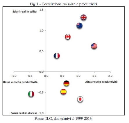 Iniziamo con l’evidenziare l’attuale correlazione tra salari e produttività nei paesi sviluppati, che mostra per l’Italia un quadro terribile. Anche se non aggiornato agli ultimi anni, il quadro è più o meno lo stesso ed è riportato nel grafico a fondo pagina. Il quale mostra la fotografia del mercato del lavoro: ad avere dei problemi è il meccanismo di funzionamento del tessuto produttivo, in primis quello industriale, ed è qui che entra in causa il “morbo” di Baumol. Esso implica che il costo unitario del lavoro aumenti di più nei settori a più bassa crescita di produttività (come quello pubblico e dei servizi) che in quelli ad alta crescita di produttività (come quello tipicamente industriale).
