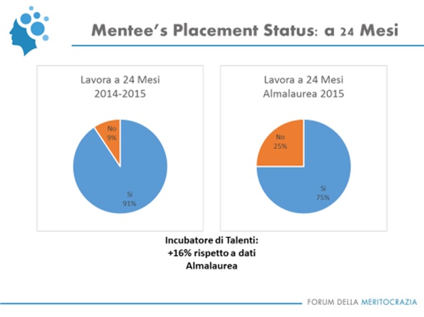 Il programma, offerto ogni anno e che comporta un abbinamento one to one con un manager e 7 incontri di gruppo in 7 mesi, è stato sviluppato con il supporto di Pino Truglia e del Forum della Meritocrazia. Da una survey condotta nel mese di marzo risulta che l’80% dei partecipanti lavora a 6 mesi dal termine del percorso di mentoring e la percentuale sale al 91% se vengono considerati i dati a 24 mesi. Questo dato (come si vede nel grafico più in basso) supera abbondantemente il risultato dei laureati in facoltà umanistiche e in generale dei giovani (+15 punti percentuali su dati Almalaurea e circa +45% su dati generali). Interessanti sono anche alcune delle aziende di “destinazione” degli studenti (le aziende elencate nella grafica a fine articolo non hanno partecipato al programma).
