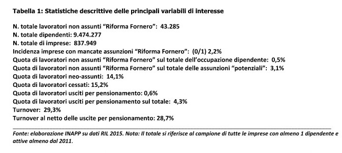 L’analisi empirica dell’Inapp sulla riforma pensioni è condotta nel 2015 su di un campione di 30mila imprese del settore privato extra-agricolo. Da essa risulta che la riforma Fornero avrebbe prodotto un cambiamento nei piani di assunzione programmati nel periodo 2012-2014 per circa il 2,2% delle aziende considerate, con la conseguenza di mancate assunzioni per 43.285 dipendenti. In sostanza una perdita di nuovi ingressi pari a circa lo 0,5% del totale dei dipendenti stimato nel 2014 (poco meno di 9,5 milioni) e al 3,1% se rapportato al numero di assunzioni potenziali. La tabella qui sotto riprende le principali variabili della ricerca.