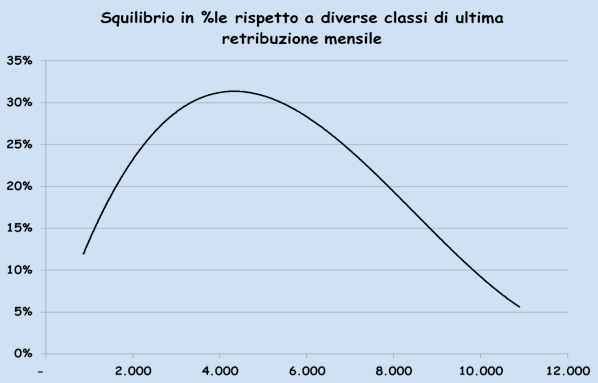Alla fine degli anni 80, a tale situazione fu posto rimedio con una normativa tuttora vigente. Il rendimento del 2% annuo veniva garantito fino a un certo importo della retribuzione (oggi si è arrivati a circa 45mila euro annui), mentre per le fasce superiori il rendimento decresceva gradualmente fino allo 0,90%. È un correttivo importante, che riduce l’effetto premiale del calcolo retributivo, che – come dimostra il grafico sottostante – determina un minore scostamento rispetto ai contributi versati nel caso delle pensioni più elevate se messe a confronto con quelle di valore medio-basso. In sostanza, lo scostamento con la contribuzione versata è più marcato per i trattamenti intorno ai 4mila euro lordi che per quelli più elevati.