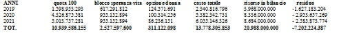 Nella tabella vengono indicati i costi complessivi stimati di Quota100, del blocco della speranza di vita per le pensioni anticipate della proroga do Opzione donna. Come si può evincere, i costi complessivi stimati nel triennio ammontano a 13.778.305.853 euro, mentre, le risorse stanziate nella Legge di bilancio 2019 sono pari a 20.988.000.000. Vi è quindi un residuo di risorse che non verranno utilizzate nel triennio, pari 7.202.224.387, cosi suddivise: 1.627.693.344 nel 2019, 2.953.657.269 nel 2020, 2.585.873.774 nel 2021.