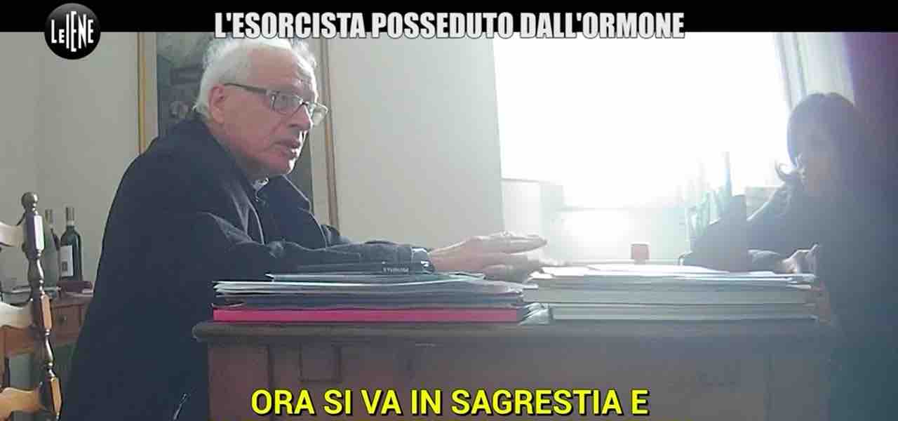 Il prete durante l’esorcizzo continua a toccare la donna davanti al compagno Renato. Poco dopo invita anche l’uomo che benedice nelle parti basse con la formula “spezzo rompo sciolgo e anniento”, ma poco dopo torna ad occuparsi della donna. E’ chiaro che l’interesse del prete è tutto per la donna a cui continua incurante a palpare il ventre. Il prete poi si lascia andare ad una serie di domande sulla vita sessuale della coppia. “Il vostro rapporto come va” chiede il prete, ma Renato risponde “così così”. Allora il prete scherzando si propone come diversivo “magari una sera vengo anche io” – precisando – “vengo per vedere che fate l’amore insieme” e domanda alla coppia “la prossima volta portatemi una mutanda”. Sul finale la Iena Agresti cerca di incontrarlo, ma l’uomo non vuole incontrarlo “non ho alcuna dichiarazione da fare, ho soffiato sulle orecchie delle signora non le ho dato nessun bacio, questa è mistificazione”. Clicca qui per il video completo del servizio.