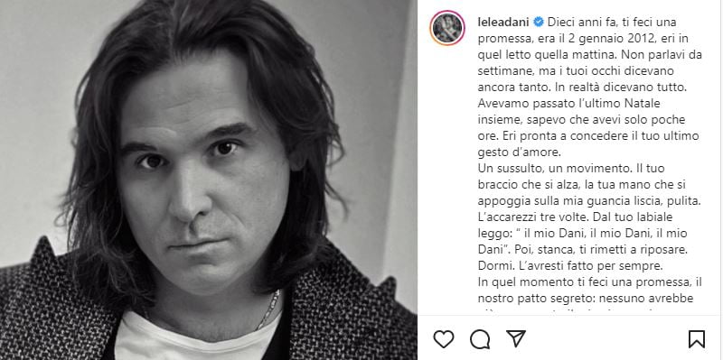 “Non parlavi da settimane – scrive l’ex giocatore – ma i tuoi occhi dicevano ancora tanto. In realtà dicevano tutto. Avevamo passato l’ultimo Natale insieme, sapevo che avevi solo poche ore. Eri pronta a concedere il tuo ultimo gesto d’amore”. Ed ecco cos’accadde: “Un sussulto, un movimento. Il tuo braccio che si alza, la tua mano che si appoggia sulla mia guancia liscia, pulita. L’accarezzi tre volte. Dal tuo labiale leggo: “il mio Dani, il mio Dani, il mio Dani”. Poi, stanca, ti rimetti a riposare. Dormi. L’avresti fatto per sempre”.