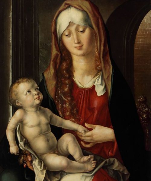 Solo il genio di Dürer poteva concepire un’immagine di Madonna così giovanile, intimista e allo stesso tempo ferma e precisa, in perfetto equilibrio tra sentimento e riflessione, affetto verso il Bambino e presa in carico di tutta la sua responsabilità di Madre. Sguardo fisico e insieme sguardo interiore. Sguardo che scende e si srotola come un balsamo dai capelli ramati, così soffici e sottili, e che sfuggono ai due lati del velo color ruggine per posarsi sulla mano.