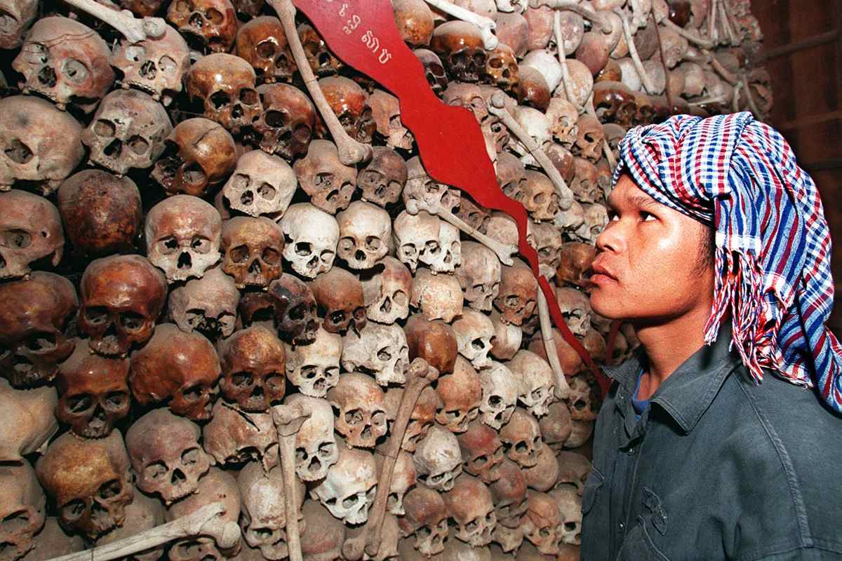 Teschi di persone uccise dai Khmer Rossi esposti a Phnom Penh (Ansa)