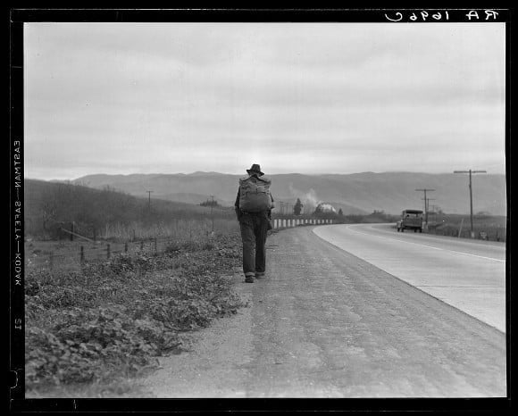 Dorothea Lange, Uomo cammina Bum blockade. All heading north. South of King City, California, 1936. Copyright CSAC Università di Parma