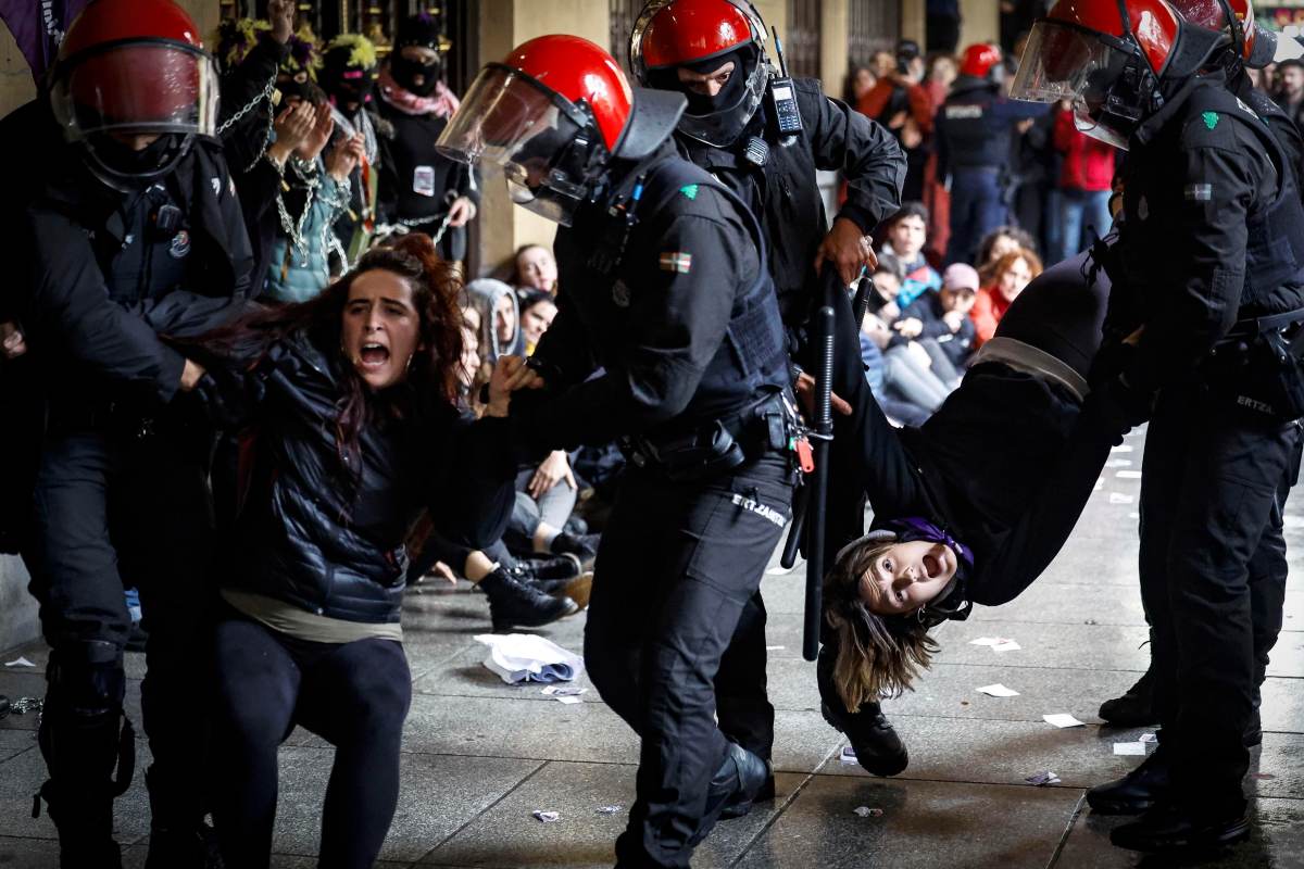 Dimostranti portate via dalla polizia durante un rally femminista, San Sebastian, Paesi Baschi, Spagna (Ansa)