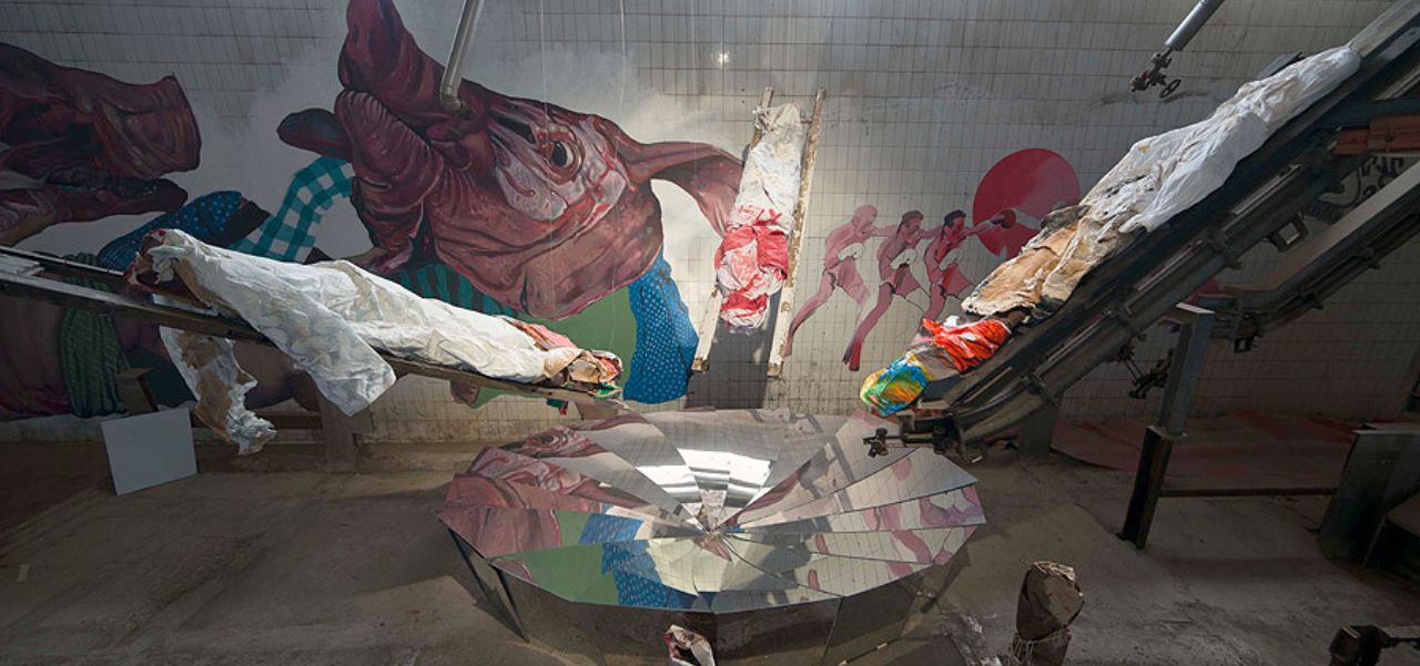 Il toro di Pennacchi prende vita grazie a materiali di risulta, una vecchia moto di cui resta solo il telaio su cui poggia un lenzuolo rosso a suggerire il sangue della bestia uccisa, e una testa curva che nient’altro è che il vecchio motore della Guzzi, capovolto e posto di fronte ad uno specchio. Lo specchio, suggerisce l’artista, spoglia le creazioni della loro violenza, le trasferisce in un’altra dimensione. Pare, in effetti, che la superficie specchiante consenta a chi osserva di immergersi, varcando una soglia, dentro uno spazio in cui le immagini scivolano lentamente entro pareti di ovatta, e si deformano, con strana levità.