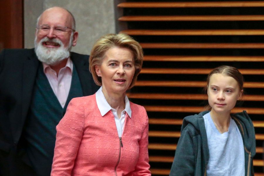 Verso il baratro: da s., l’allora vicepresidente della Commissione con delega al Green Deal, Frans Timmermans, Ursula von der Leyen e Greta Thunberg nel 2020 (Ansa)