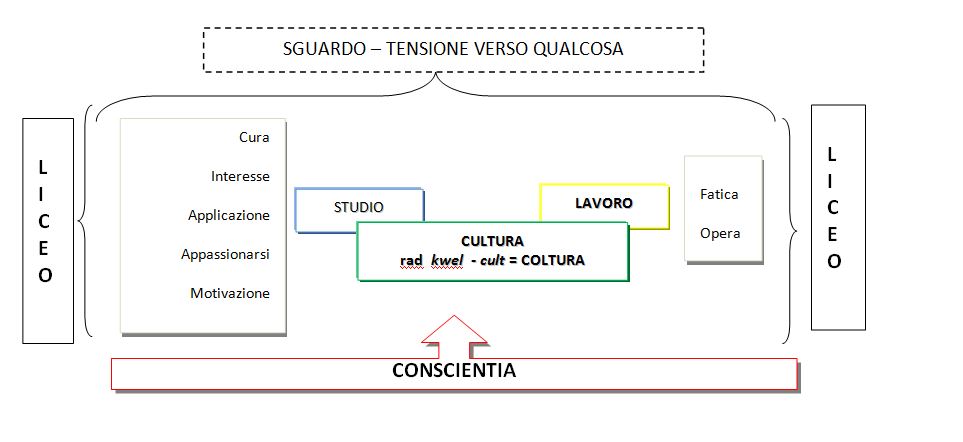 In tale prospettiva, il liceo opera sulla base del legame tra studio – cultura – lavoro. Le etimologie di tali parole hanno il centro semantico nella “tensione per qualcosa”:  stud-  riconduce all’ “adoperarsi”; cult- (da kwel-“ruotare, girare” dunque “rivoltare la terra, dissodare”) al “coltivare, attendere con cura” ed il suffisso “-ura” del participio futuro a “cose prossime alla coltivazione”, a “fare crescere”; labh- all’ “afferrare” e, in senso figurato, “volgere il desiderio, la volontà, l’intento a qcsa”3. Inoltre le parole intorno allo studio sono accomunate dall’idea dello sguardo o della proiezione a qualcosa con cui si è implicati per contatto, per compresenza, per intenzione, per sentire: “applicazione” e “appassionare” hanno il prefisso ad- “verso”, il primo con la radice greca plek- “piegare” –esito: “apporre un oggetto ad un altro affinché si tocchino”-, il secondo con pat- “soffrire”, nel senso positivo di “curiosità, scoperta” quindi “provare molto interesse”; “cura”, ossia “preoccupazione, sollecitudine”, deriva dalla radice ku– (kau, kav) “osservare, guardare”; “interesse” con il prefisso inter– è come dire “essere fra le cose di alcuno”; “motivazione” contiene mot, ossia “movimento” verso qualcosa: queste parole implicano attivismo, partecipazione operativa4.