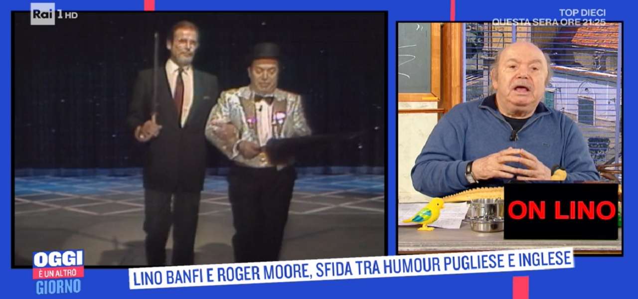 Come ogni lunedì ed ogni venerdì, Lino Banfi grande protagonista a Oggi è un altro giorno. Il celebre attore pugliese riceve chiamate e messaggi dai suoi fans, ma commenta anche insieme a Serena Bortone la sua grande carriera ed oggi è stato mandato in onda uno spezzone di un momento storico del piccolo schermo: Lino Banfi e Roger Moore insieme sul palco per cantare.