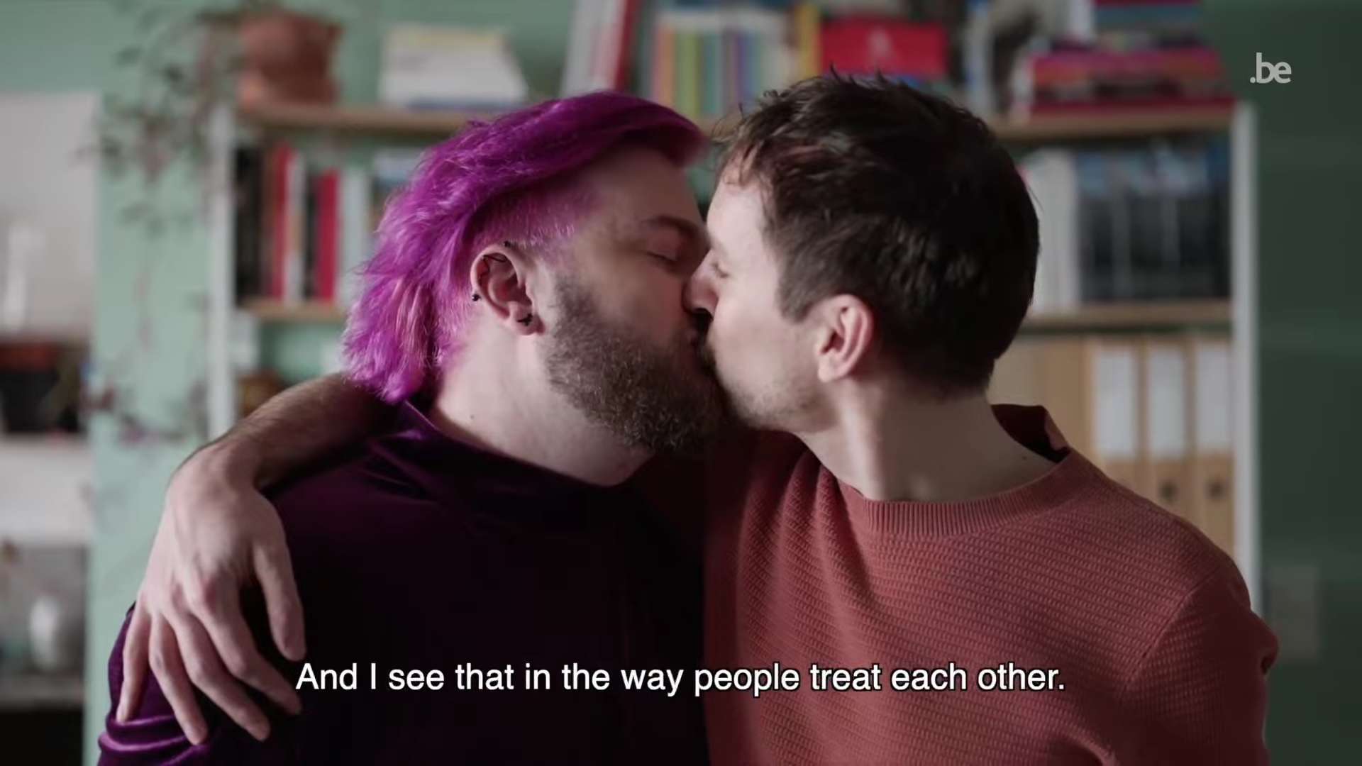 E ancora, il video realizzato dal governo belga vede l’indiano Nandakumar che lavora come oncologo neolaureato in un ospedale di Bruxelles l’americano Jasper – con i capelli color fucsia – che si beve un caffè sul balcone della sua abitazione insieme al fidanzato. Ovviamente non manca l’abbraccio e il bacio passionale.