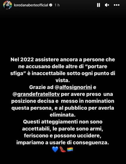 “Nel 2022 assistere ancora a persone che ne accusano delle altre di ‘portare sfiga’ è inaccettabile sotto ogni punto di vista.” ha esordito Loredana Bertè in un post pubblicato su Instagram. Ha dunque proseguito: “Grazie ad Alfonso Signorini e al Grande Fratello Vip per avere preso una posizione decisa e messo in nomination questa persona, e al pubblico per averla eliminata. Questi atteggiamenti non sono accettabili, le parole sono armi, feriscono e possono uccidere, impariamo a usarle di conseguenza”.