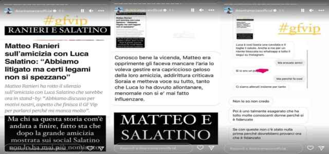 Tra Luca Salatino e Matteo Ranieri, l’amicizia sarebbe giunta al capolinea come fa notare Deianira Marzano che, tra le storie del suo profilo Instagram, ha scritto: “Conosco bene la vicenda. Matteo era opprimente, gli faceva mancare l’aria, lo voleva gestire, era capriccioso geloso della loro amicizia, addirittura criticava Soraia e metteva voce su tutto, tanto che Luca lo ha dovuto allontanare, menomale non si è mai fatto influenzare”, fa sapere l’esperta di gossip.