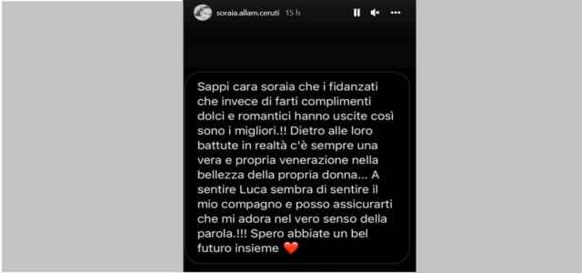 “Sappi cara Soraia che i fidanzati che invece di farti i complimenti dolci e romantici hanno uscite così sono i migliori” Dietro alle loro battute in realtà c’è sempre una vera e propria venerazione nella bellezza della propria donna. A sentire Luca sembra di sentire il mio compagno e posso assicurarti che mi adora nel vero senso della parola! Spero abbiate un bel futuro insieme”, è il testo del messaggio ricevuto da Soraia.