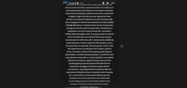 “Dal momento che è stato scritto e detto qualcosa di non solo falso ma anche calunnioso – scrive tra le sue Instagram Stories – “Asserendo al fatto che io abbia avuto una frequentazione in precedenza con una ragazza conosciuta invece la sera in questione, quindi mai vista prima e mai più vista in seguito, tengo a dire solo una cosa: quando sono stato lasciato, ho accetto di rispettare non solo la decisione della mia ex compagna ma anche la sua decisione di non rendere pubblici i dettagli della stessa, ho deciso di uscire di casa in autonomia e proseguire la mia vita come ho sempre fatto, facendomi forza e basandomi su ciò che ho sempre tenuto alto, i miei valori, l’affetto della mia famiglia e i miei amici”, aggiunge.