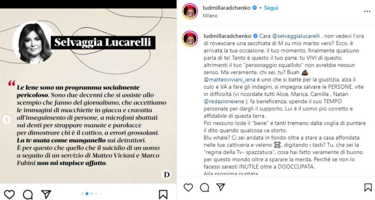 Oggi è giunta la risposta di Ludmilla Radchenko, storica compagna proprio di Matteo Viviani, che ha difeso l’inviato de Le Iene, scrivendo così su Instagram: “Cara @selvaggialucarelli, non vedevi l’ora di rovesciare una secchiata di M su mio marito vero? Ecco, è arrivata la tua occasione, il tuo momento, finalmente qualcuno parla di te! Tanto è questo il tuo pane, tu VIVI di questo, altrimenti il tuo “personaggio squallido” non avrebbe nessun senso. Ma veramente, chi sei, tu? Buah”.