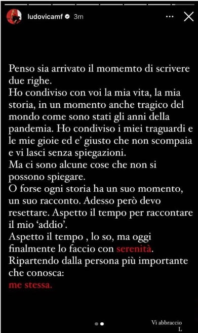 “Penso sia arrivato il momento di scrivere due righe.” ha allora esordito Ludovica Frasca su Instagram. Annunciando poi la fine del suo matrimonio e la volontà di dedicarsi ora a se stessa: “Ho condiviso con voi la mia vita, la mia storia, in un momento anche tragico del mondo come sono stati gli anni della pandemia. Ho condiviso i miei traguardi e le mie gioie ed è giusto che non scompaia e vi lasci senza spiegazioni. Ma ci sono alcune cose che non si possono spiegare. O forse ogni storia ha un suo momento, un suo racconto.”