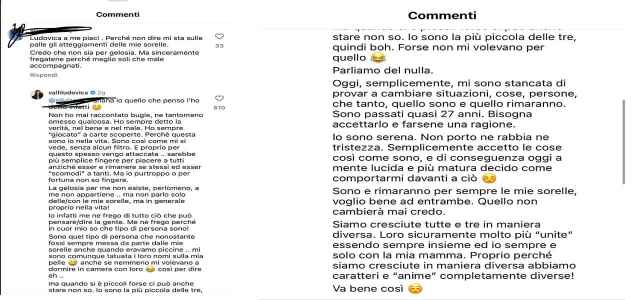 “Sono quel tipo di persona che, nonostante fossi messa sempre da parte dalle mie sorelle anche quando eravamo piccine, mi sono comunque tatuata i loro nomi sulla mia pelle anche se nemmeno mi volevano a dormire in camera con loro ma quando si è più piccoli forse ci può anche stare. Oggi, semplicemente, mi sono stancata di provare a cambiare situazioni, cose, persone che tanto quelle sono e quelle rimarranno. Sono passati quasi 27 anni. Bisogna accettarlo e farsene una ragione. Sono e rimarranno sempre le mie sorelle, voglio bene ad entrambe. Quello non cambierà mai credo“, conclude Ludovica.