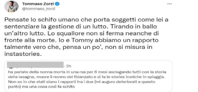 “Pensate lo schifo umano che porta soggetti come lei a sentenziare la gestione di un lutto. Tirando in ballo un’altro lutto. Lo squallore non si ferma neanche di fronte alla morte. Io e Tommy abbiamo un rapporto talmente vero che, pensa un po’, non si misura in instastories”, ha cinguettato Zorzi zittendo tutti gli haters.