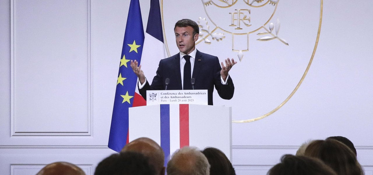 Emmanuel Macron, Presidente Francia incontra gli ambasciatori all'Eliseo (LaPresse, 2023)