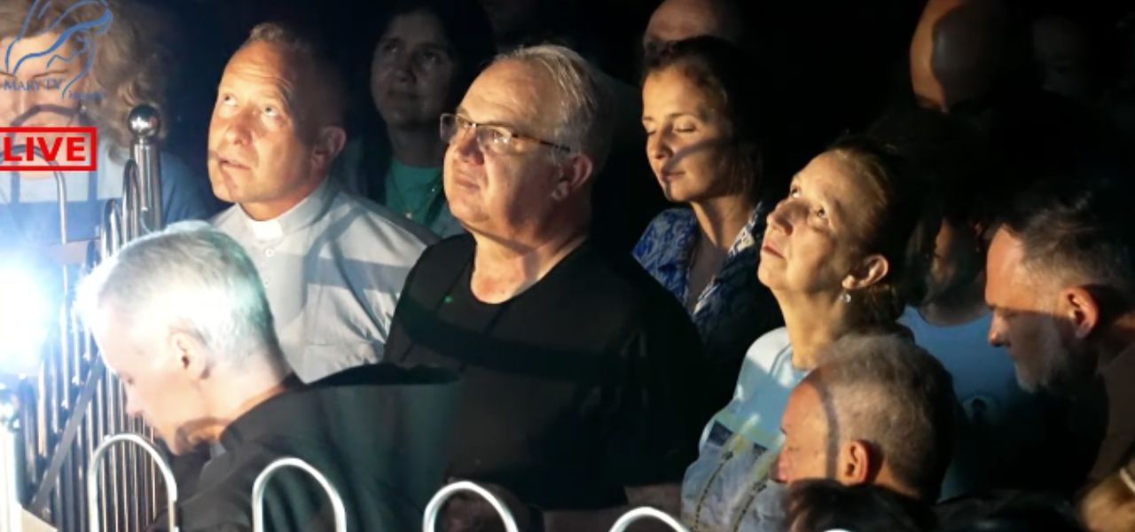 Poco dopo le ore 23:30 – come da programma – Marija ha rivolto il suo sguardo verso la statua della Madonna di Medjugorje, rimanendo ferma con gli occhi al cielo e pronunciando poche parole incomprensibili a bassa voce: è l’attesa apparizione mariana che chiude questa novena del 2024 e lascia tutti i fedeli (sempre con gli occhi puntati verso il cielo) in attesa dell’ormai consueto messaggio che verrà pronunciato nella giornata di domani dalla stessa veggente più volta protagonista delle apparizioni. “La Madonna è venuta da noi – ha detto ai fedeli la veggente Marija dopo l’apparizione a Medjugorje – e ci ha ringraziati per le nostre preghiere e i sacrifici e ha detto continuate. Era vestita d’oro, come sempre su una nuvola e con una corona di stelle. Noi abbiamo raccomandato alla Madonna tutti voi e tutto quello che avete nei vostri cuori. La Madonna ha pregato per la pace e ha benedetto tutti“. (agg di LD)