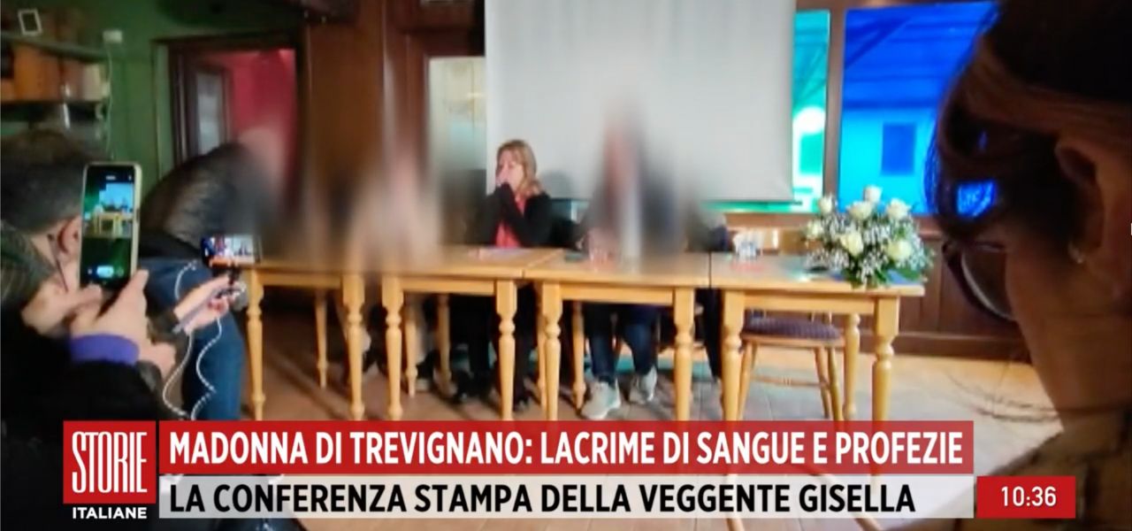 Gisella, in conferenza stampa, ha parlato poi della Madonna di Trevignano, che a suo dire piangerebbe sangue, ma non sarebbe la sola: avrebbe pianto anche l’immagine di un Cristo acquistata a Roma. La statua e l’immagine non vengono portate fuori dalla casa, per preservarle. Secondo Gisella, ogni 3 del mese, alle ore 15, la Madonna dà dei massaggi. Dei fedeli che hanno partecipato più volte a questi incontri hanno raccontato che, alla quarta preghiera del rosario, la donna si inginocchia e la Madonna inizia a parlare. Secondo quanto spiegato ancora dall’inviata di Storie Italiane, la Madonna avrebbe predetto la guerra e il Covid.