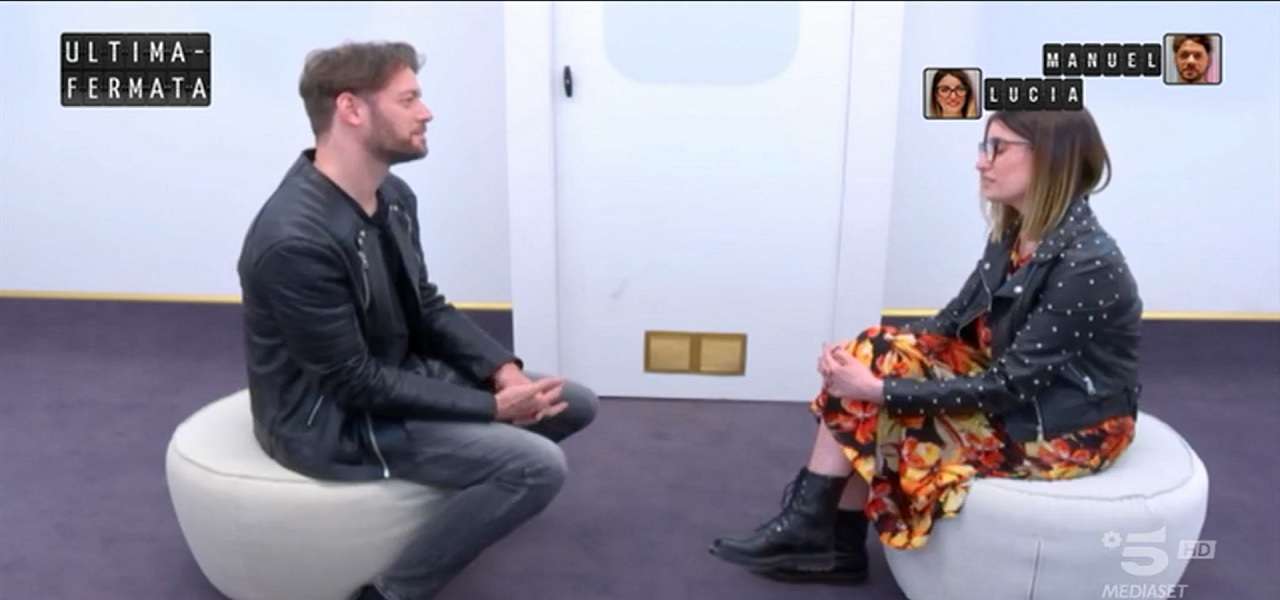 Dopo tre richieste, Manuel riesce ad ottenere il confronto con Lucia a Ultima Fermata. È lui ad aprire il colloqui, manifestando i suoi malumori: “In questa settimana ho notato solo offese, sono stato deriso, umiliato, mancarmi di rispetto andando a ballare in discoteca, sculettare, alzarsi il vestito… Ti sembra normale? Io ti porto qui, cercando di capire se possiamo recuperare e tu fai questo? Perché mi hai scelto se sei insoddisfatta? Mi hai preso in giro per due anni? Io non lo penso perché ti amo!” E ammette: “A me non piace come sei adesso”.