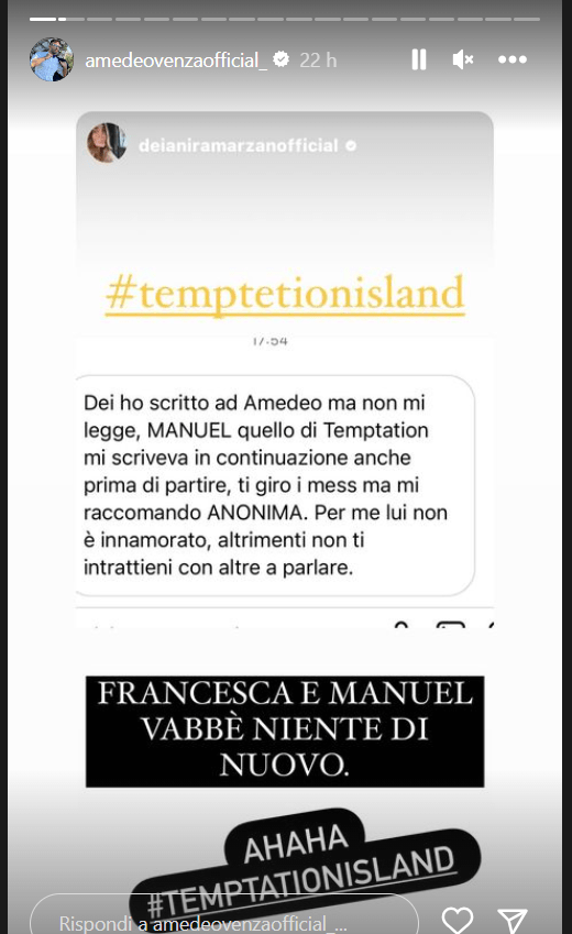 “Manuel, quello di Temptation, mi scriveva in continuazione anche prima di partire.” ha scritto l’utente nel suo messaggio a Deianira, sentenziando: “Per me lui non è innamorato, altrimenti non ti intrattieni con altre a parlare.” I contatti di Manuel con altre ragazze non si limiterebbero dunque ai momenti di rottura con Francesca. Lui stesso, in un confessionale, ha rivelato di aver sentito e visto altre ragazze quando lasciava la fidanzata; tuttavia, i contatti con questa utente misteriosa sarebbero avvenuti anche poco prima di Temptation, quando Manuel e Francesca, presumibilmente, stavano insieme. Che lui le abbia dunque mentito?