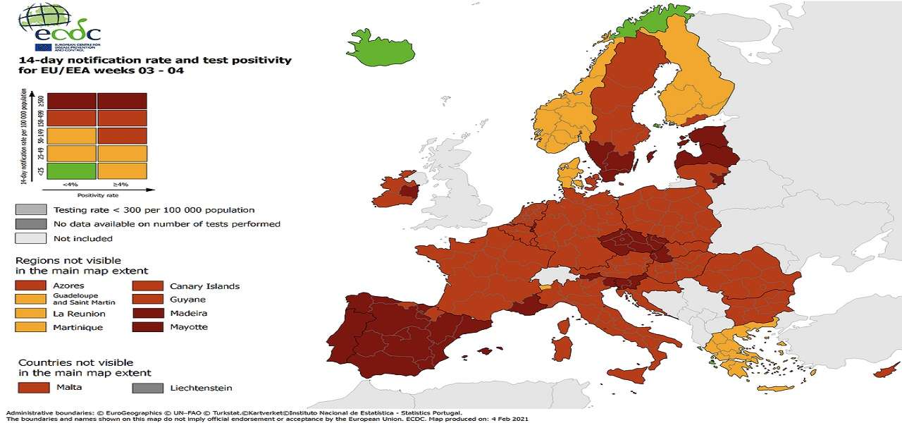 L’Ecdc, il Centro europeo per la prevenzione ed il controllo delle malattie, ha aggiornato la mappa europea delle aree a rischio Covid