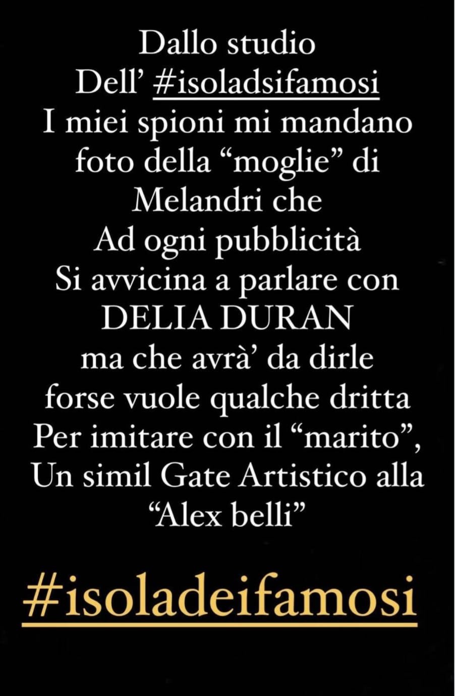 Parole quelle di Marco Melandri che si registrano mentre nello studio de L’isola dei famosi, la moglie storica dello sportivo sembra non tollerare la vicinanza di Cicciolina al consorte, a suon di frecciatine “deve insegnarmi i trucchetti del mestiere”, in riferimento alla manifesta capacita della pornodiva di sapersi tenere un uomo stretto a sé, così come ora si registra in Honduras. “Conosciamo l’intero kamasutra”, è la provocazione che lancia quindi Cicciolina, dai toni bollenti, segno che la naufraga si dica disposta a concedersi alla passione, ora che fa coppia fissa in Honduras. Ma intanto la blogger Deianira Marzano getta ombre sul conto dei coniugi storici, tacciandoli di fingere una reunion matrimoniale -sui social così come in tv- tra loro, perché intenti a ripulire l’immagine del campione dai presunti tradimenti inferti alla consorte. Questo allo scopo di condurlo alla vittoria del reality show. . “I miei spioni mi mandano foto della moglie di Melandri che si avvicina per parlare a Delia Duran (ospite in studio, per L’isola)… forse per imitare con il marito un simil gate-artistico alla Alex Belli”, è l’affondo della blogger ai danni dei consorti Melandri.