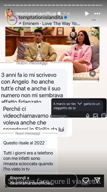 In effetti, a corredo della segnalazione, Deianira mostra anche il messaggio di Angelo alla ragazza in questione, inoltrato all’esperta di gossip. In questo, Angelo le propone di andare in Sicilia da lui a marzo “se riesco a organizzare”, sottolinea. Il fidanzato di Maria Concetta desiderava, dunque, che la donna facesse un ‘viaggetto’, come lui stesso scrive nel messaggio. La ragazza della segnalazione sottolinea che i contatti risalgono al 2022, quando però Angelo era già fidanzato. Un messaggio sicuramente scomodo, che potrebbe venire a galla anche durante la partecipazione a Temptation Island 2025, come d’altronde accaduto in alcune edizioni passate del programma condotto da Filippo Bisciglia. Come reagirebbe, in quel caso, Maria Concetta?