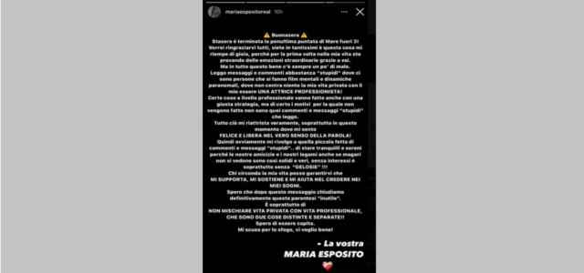 Lo sfogo di Maria Esposito ha rapidamente fatto il giro del web. Molti fan si sono schierati dalla parte dell’attrice condannando i rumors e il gossip che si è scatenato intorno ai protagonisti della serie tv evento che ha conquistato sia i giovani che gli adulti. L’attrice, così, ribadisce: