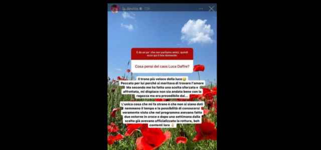 Maria Laura De Vitis, ex concorrente dell’Isola dei Famosi 2022 dove ha conosciuto Luca Daffrè, commenta la fine della storia tra l’ex tronista e Alessandra Somensi. Arrivato sul trono di Uomini e Donne per ultimo, Luca ha fatto fatica a trovare una persona con cui avviare una conoscenza duratura nonostante il grande numero di ragazze disposte a corteggiarlo. Tra tutte, però, Luca era riuscito a trovare un feeling particolare con Alessandra al punto da sceglierla nonostante la poca conoscenza. Poche ore dopo la scelta, però, qualcosa si è subito rotto tra i due. Dopo pochi giorni dalla scelta nel programma di Maria De Filippi, infatti, l’ex tronista ha annunciato la rottura.