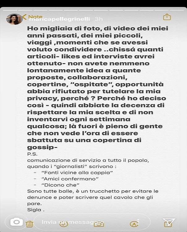 Il lungo sfogo social di Marica Pellegrinelli continua con un appello a chi continua a mettere la sua vita privata e amorosa sui giornali. “Abbiate la decenza di rispettare la mia scelta e di inventarvi ogni settimana qualcosa.” ha tuonato la modella. Che ha poi aggiunto: “Fuori è pieno di gente che non vede l’ora di essere sbattuta su una copertina di gossip. – così chiude – Comunicazione di servizio, quando i giornalisti scrivono: “fonti vicine alla coppia”, “amici confermano”, “dicono che” sono tutte balle. È un trucchetto per evitare una denuncia e poter scrivere quello cavolo gli pare”. Una presa di posizione netta, che sembra chiaramente smentire il ritorno di fiamma con Eros Ramazzotti.