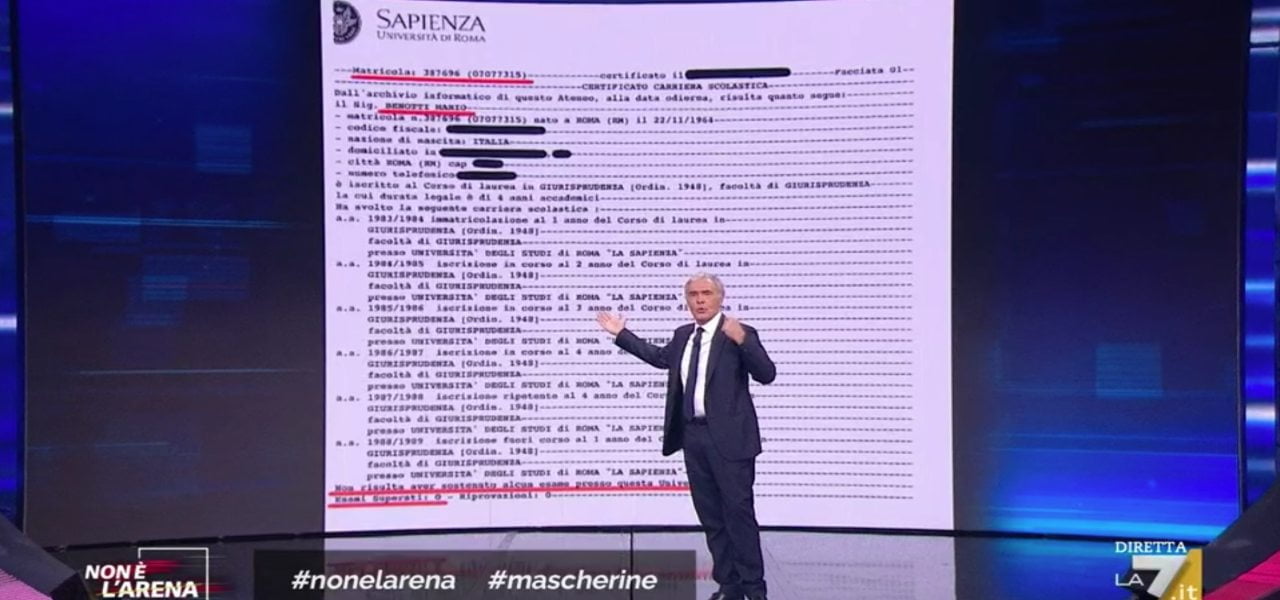 «Nelle mie mani c’è un documento sorprendente e che la dice lunga sull’attendibilità di certi personaggi». Così Massimo Giletti a Non è l’Arena introduce lo scoop su Mario Benotti nell’ambito della sua inchiesta sulle mascherine dalla Cina. Il giornalista, che ad esempio è stato consulente giuridico di Graziano Delrio quando questi era ministro, dichiara nel suo curriculum di avere una Laurea in Giurisprudenza all’Università La Sapienza di Roma. «La Rai l’avrà scelto in base al suo curriculum e al suo prestigio, quindi sarà stata attenta», prosegue il conduttore del programma di La7. Poi svela che in realtà Mario Benotti non ha alcuna laurea in Giurisprudenza conseguita nel 1988 e mostra un documento che lo attesta.