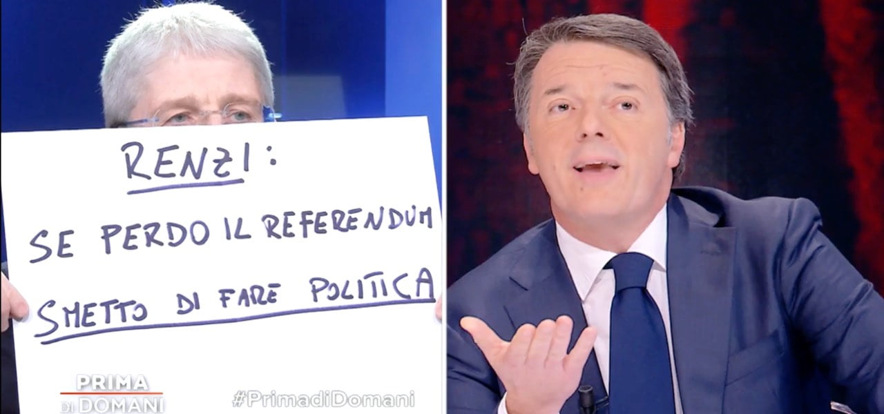Nessuno si aspettava però che Mario Giordano mostrasse un foglio bianco con la scritta: “Renzi, se perdo il referendum smetto di fare politica“. Un colpo di scena che all’ex premier non è piaciuto affatto: «Ma queste sono falsità, non si va lontano con i cartelli. Non è questo il modo, gli attacchi personali non vanno bene, se questo è il futuro della trasmissione le faccio un in bocca al lupo Bianca». I toni diventano rapidamente incandescenti: «Non si può criticare la Meloni che arriva il killer di turno», ha sbottato Renzi. Espressione che non è piaciuta affatto a Giordano: «Killer a me non lodice chiaro?! Non può dirlo». Renzi a questo punto tace e Berlinguer prova a riportare la calma in studio, ricordando il compleanno del suo ospite. A questo punto Renzi ha commentato: «Ma come si fa a festeggiare il compleanno con Giordano che mostra i cartelli? Ora vado a cena con mia moglie e i miei figli».